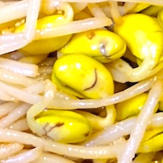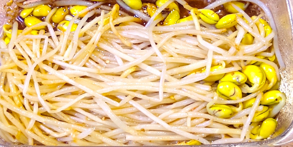 種についた土や汚れを洗い流し、根を処理して湯がき、氷水でしめて硬く絞って、醤油や酢・ごまなどで味付けし、もやしナムルにしました。