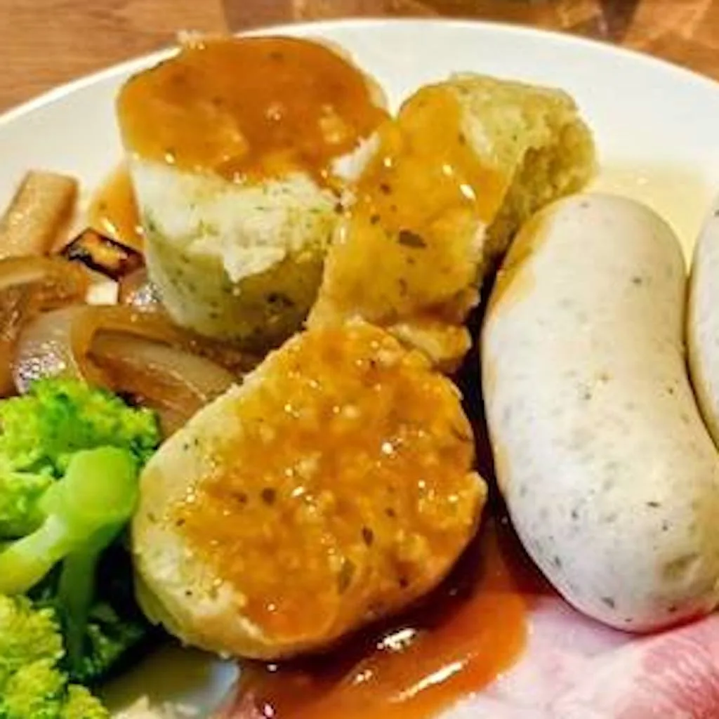 ドイツの家庭料理の一つ、クヌーデル(じゃがいも団子)とヴァイスブルスト(白いソーセージ)をいただきました。